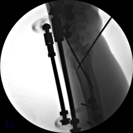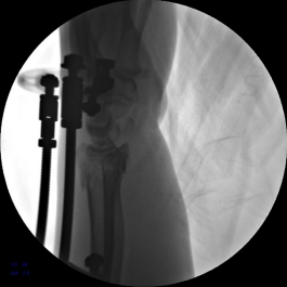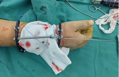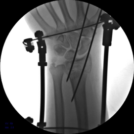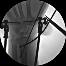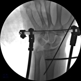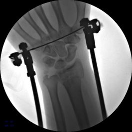 2.安装外固定架,调节螺母纵向牵拉,初步恢复桡骨高度