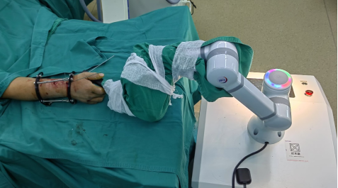 5.使用执行器夹持克氏针,于掌侧穿针,撬拨骨块并使用六轴机器人固定针末端以维持撬拨位置。